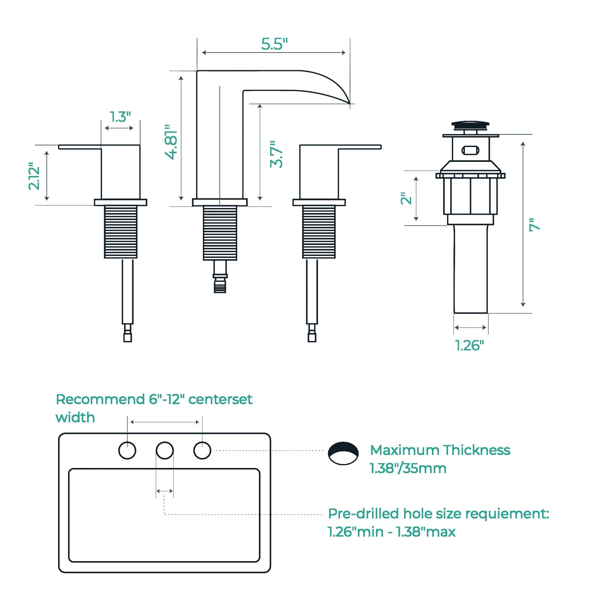 Effortless DIY Installation: with 8-inch widespread design, bathroom faucets for sink 3 hole can be easily installed in just 15 minutes by yourself with no need for a plumber. Save time and money while enjoying a hassle-free upgrade to your bathroom. The package includes matching pop-up drain, 2 supply hoses and quick connect hoses. This 6-12 inch widespread bathroom faucet allows you to adjust the installation distance as needed. Installation hole diameter: 1.26-1.38". Max deck thickness: 1.38"/35mm.