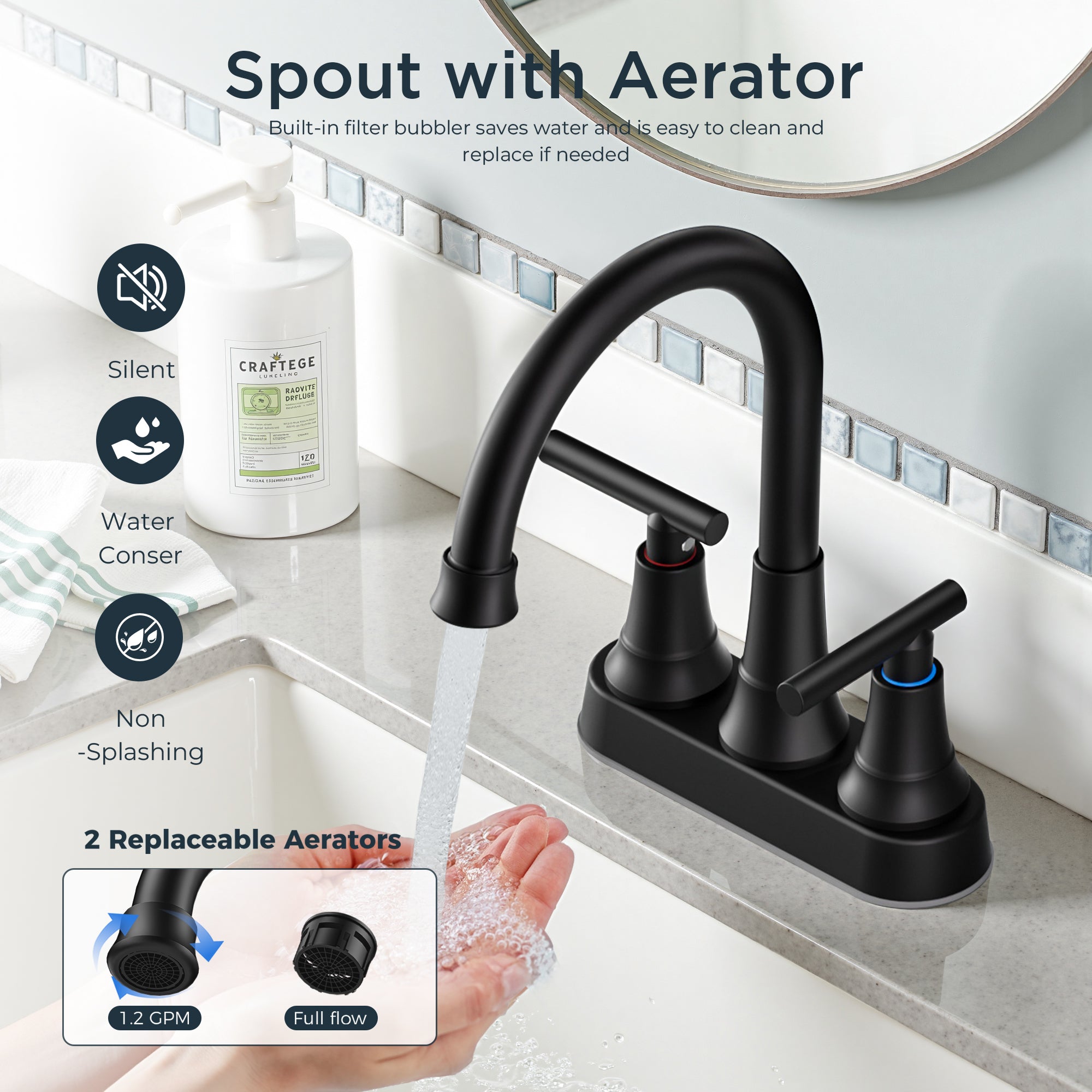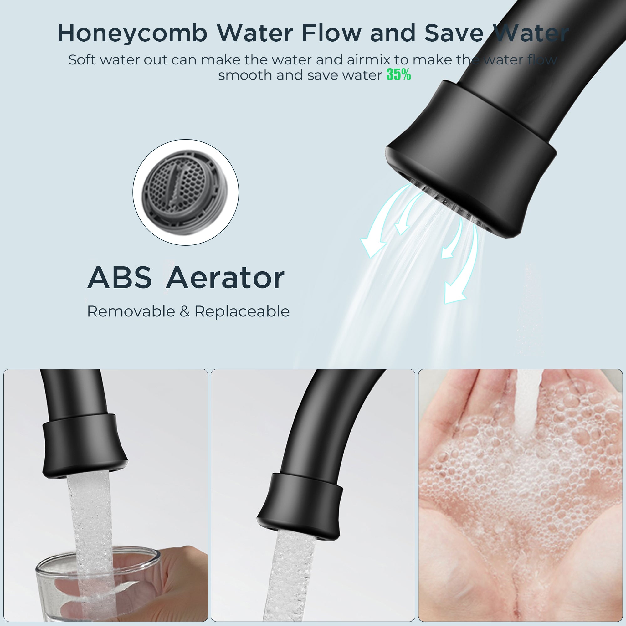 Saves Water 30%: 2 handle centerset bathroom faucets featured 1.2 gpm no-splashing water-saving bathroom sink faucet aerators. The ABS Aerators are removable and replaceable.
