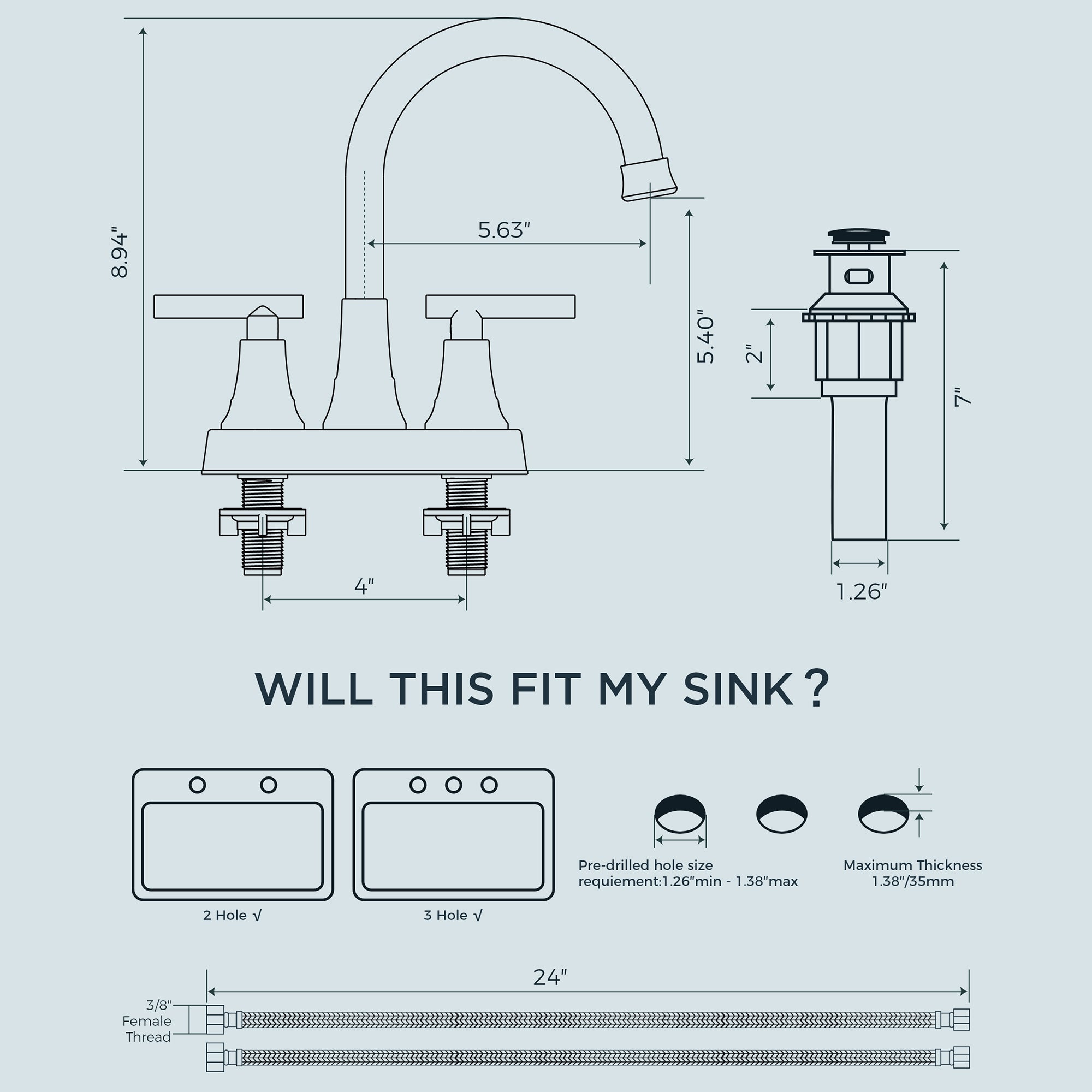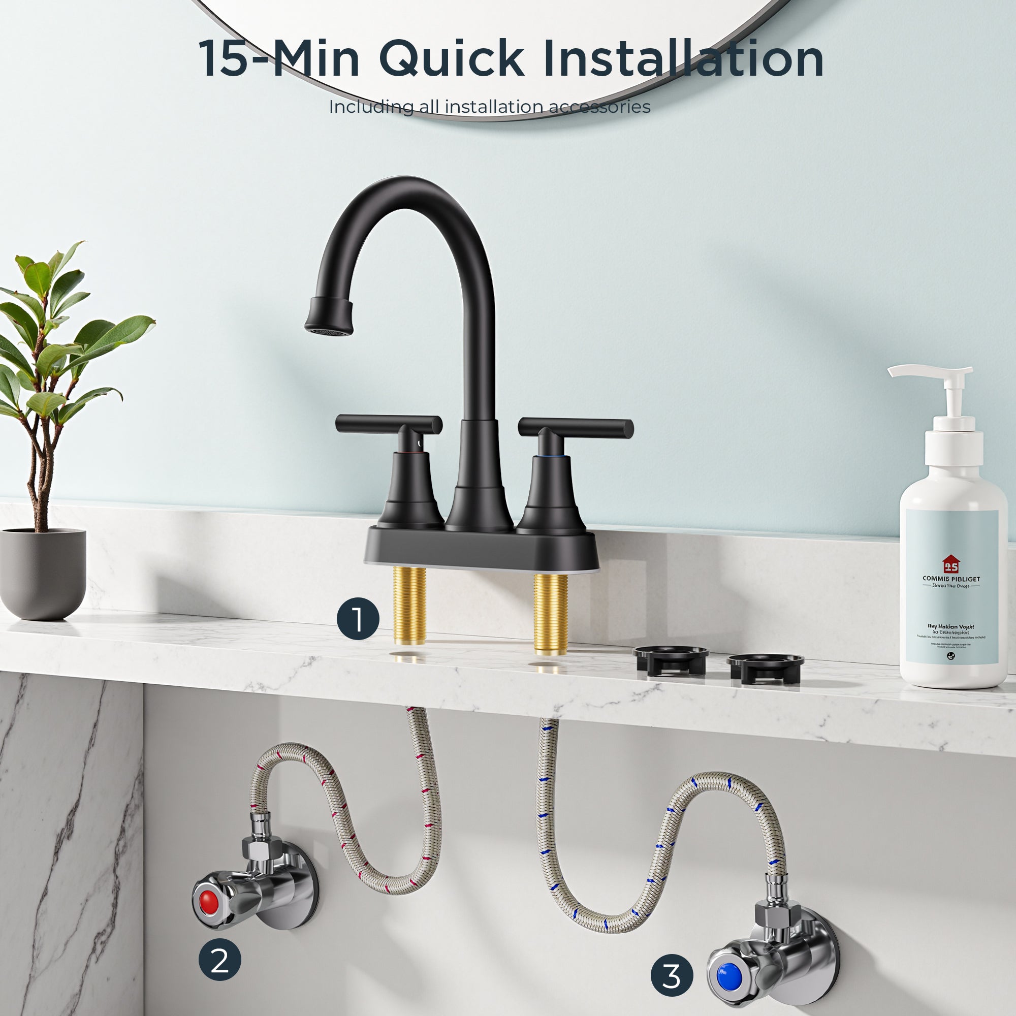 15 Mins Easy Installation: 4 inch centerset bathroom faucets for sink 2 or 3 hole or counters.15 mins with confidence. Eliminates the need for plumber, saving your both time and money. Mounting Hole Diameter:1.26-1.38inch. Max. Deck Thickness:1.38 inch.