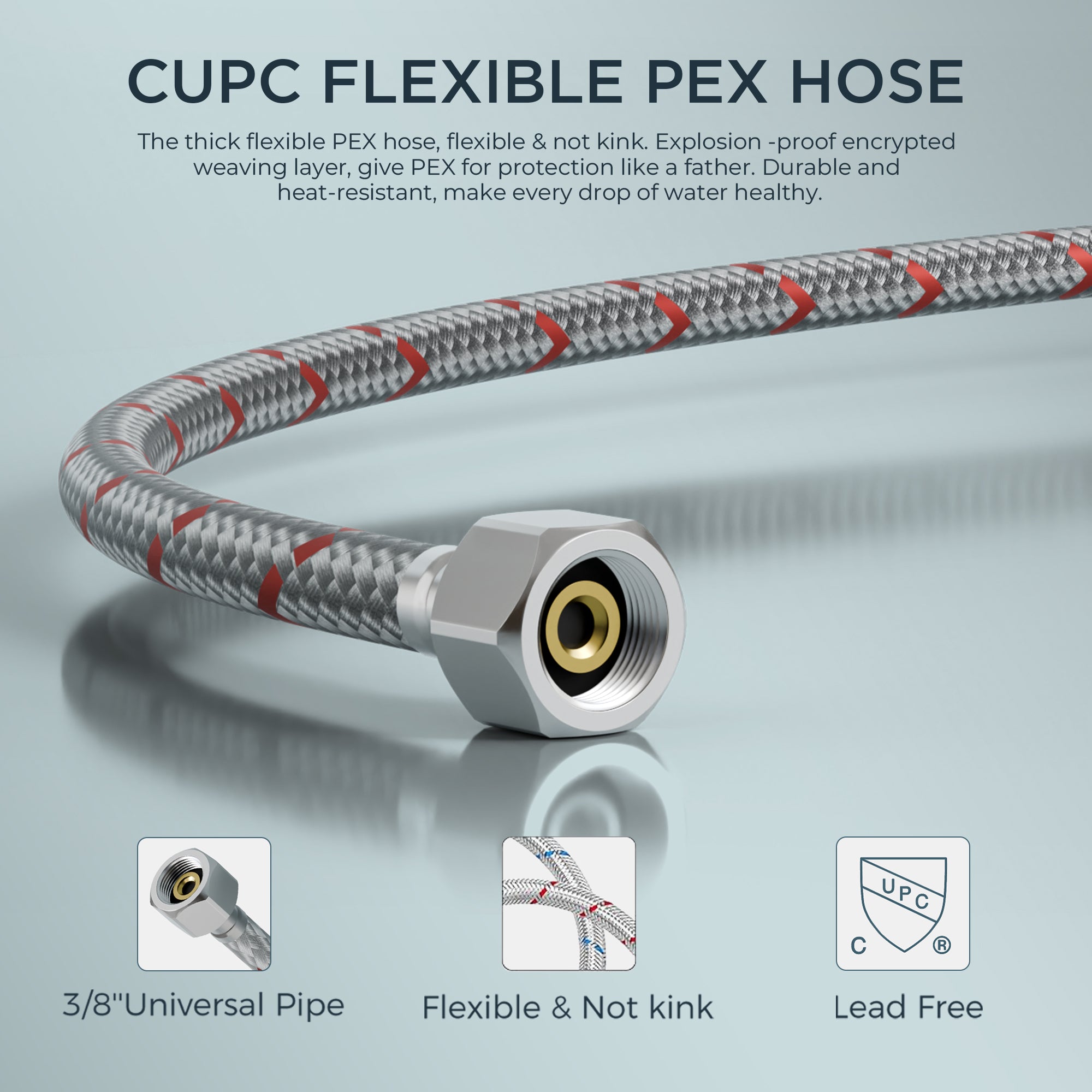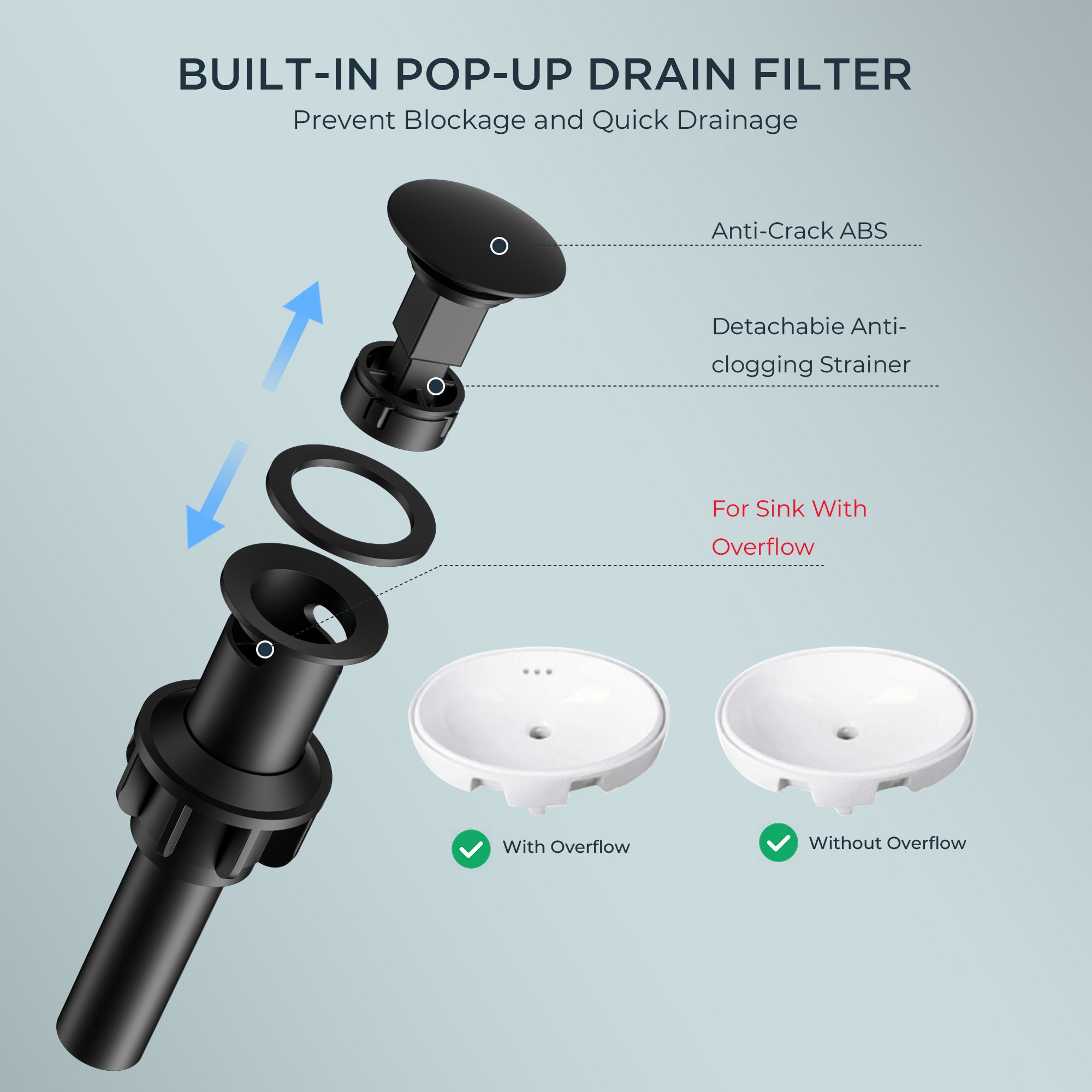 Pop-Up Drain and H/C 24-in Water Supply Lines: The Pop-up drain with built-in strainer swiftly filters debris to prevent clogs, adding convenience to your daily routine. Adopt rust-resistant nylon braided water supply lines, caring for your family's health.