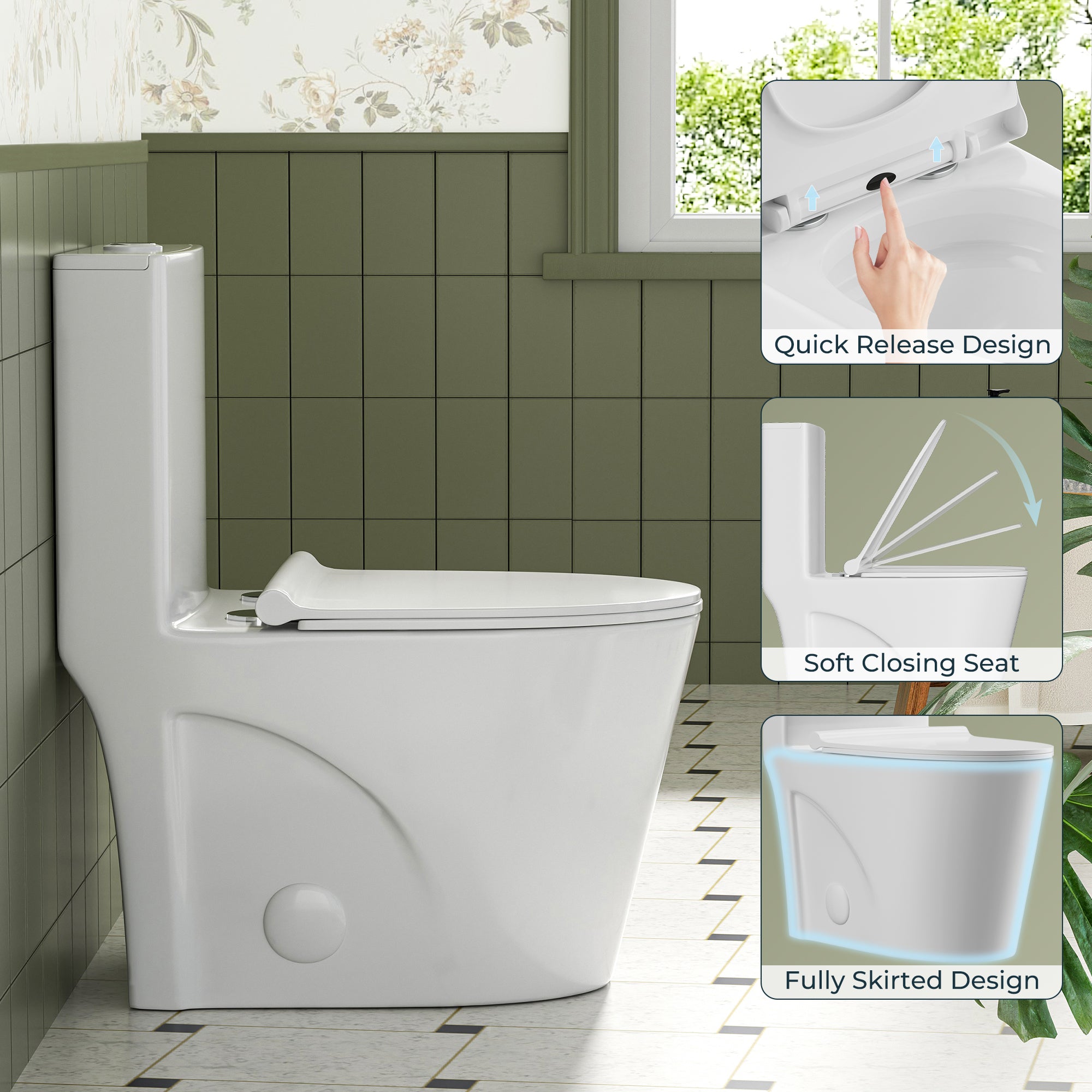 Soft Close Seat: This toilet comes with a soft-closing quick-release seat. It closes gently and quietly to avoid slamming, prevents pinched fingers, and makes deep cleaning easy when the seat is removed.