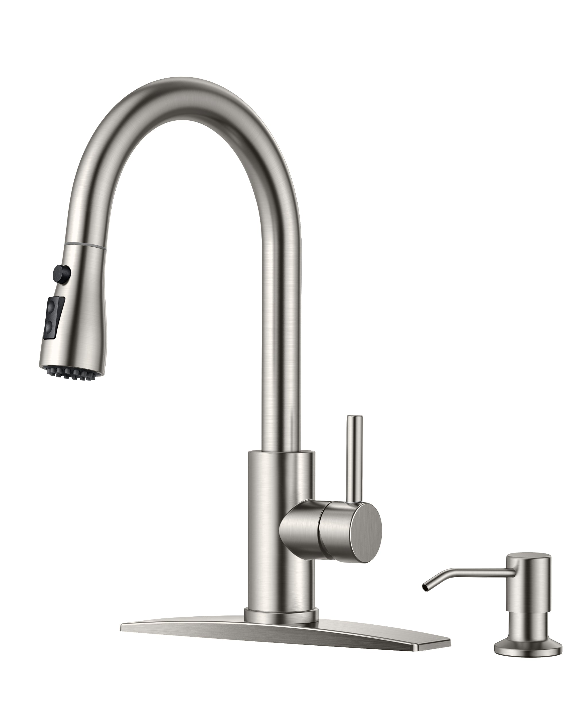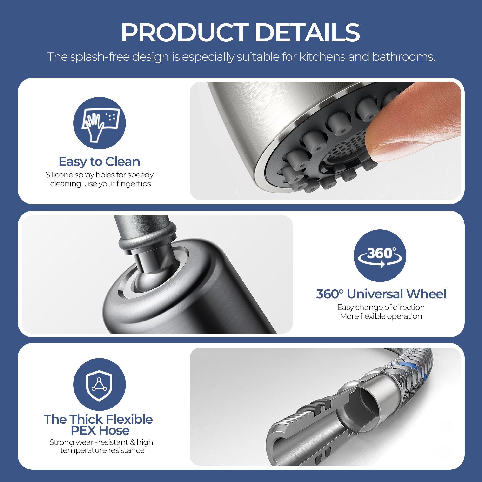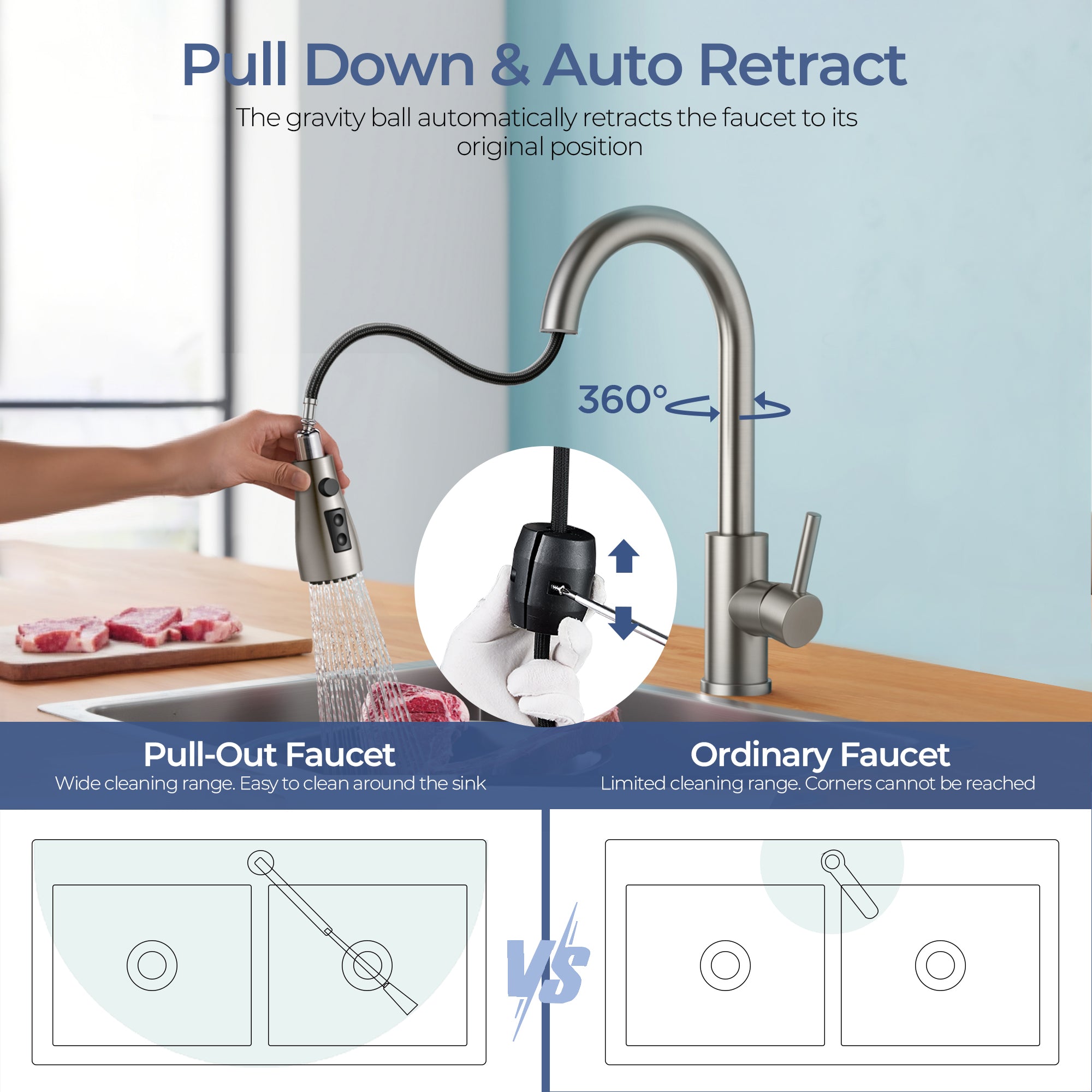 3-Mode Sprayer: The pull-down kitchen faucet offers 3 spray settings (STREAM, SPRAY, PAUSE). The 18-inch retractable hose ensures the spray head retracts smoothly and precisely thanks to its weight-controlled design.