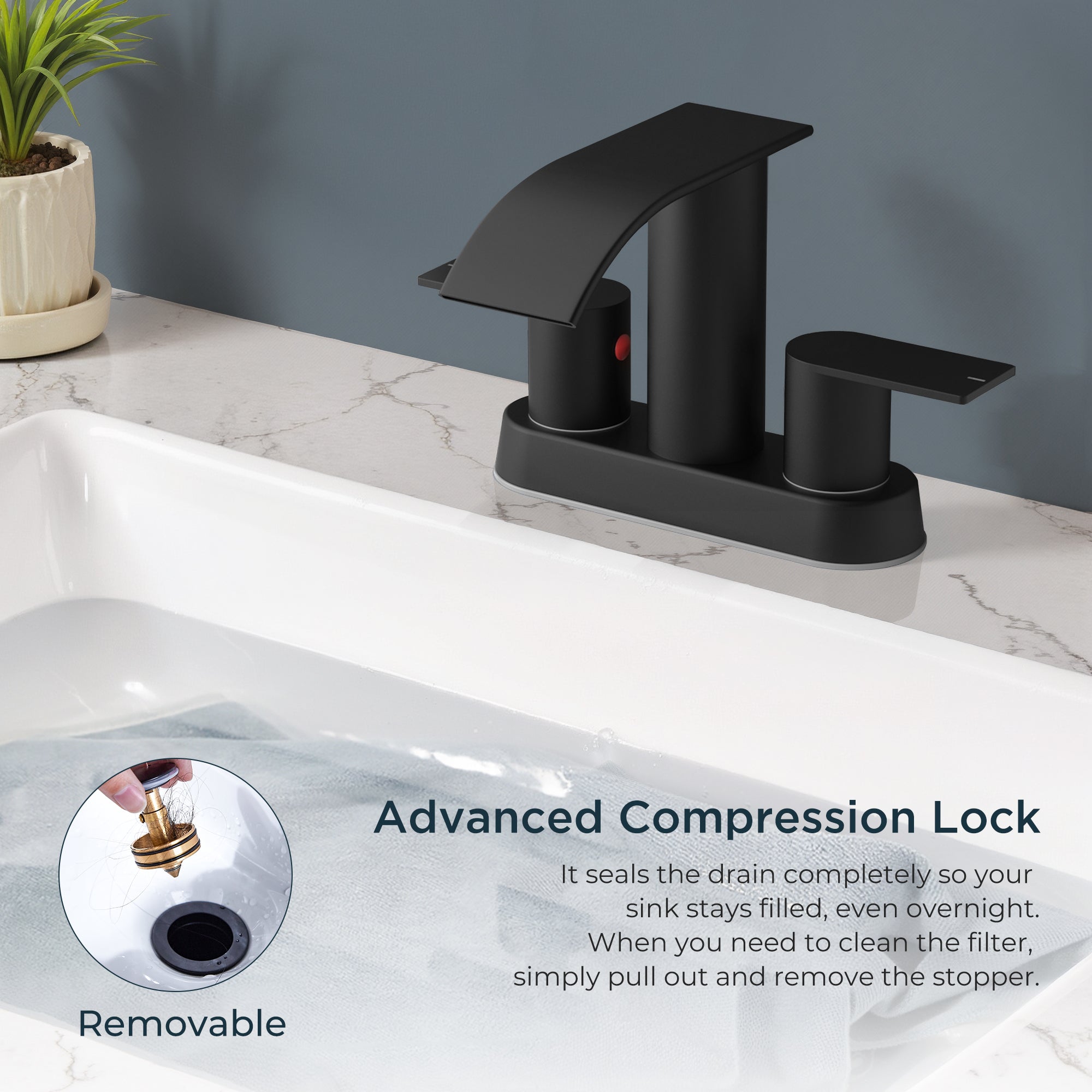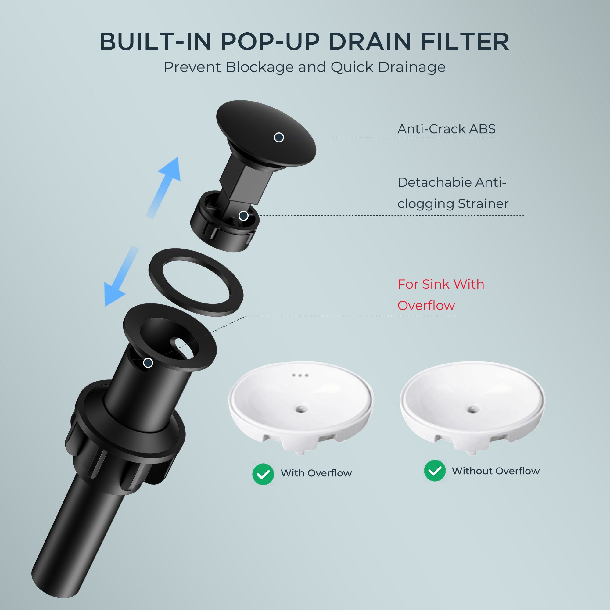 Metal Pop-Up Drain: The metal Pop-up drain with built-in strainer swiftly filters debris to prevent clogs, adding convenience to your daily routine.