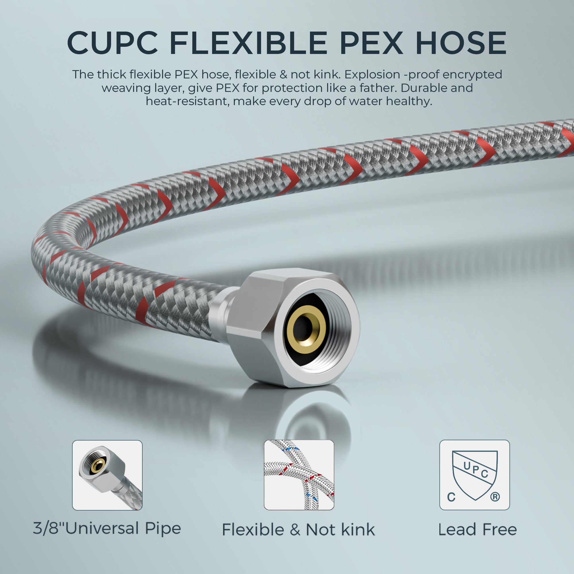 cUPC Hose: The centerset bathroom faucet integrated PEX hose is wrapped by 24" braided Flexible supply line, explosion-proof and high temperature. The 3/8 thread is designed for US standard pipe connection, the built-in rubber ring effectively avoids leakage.
