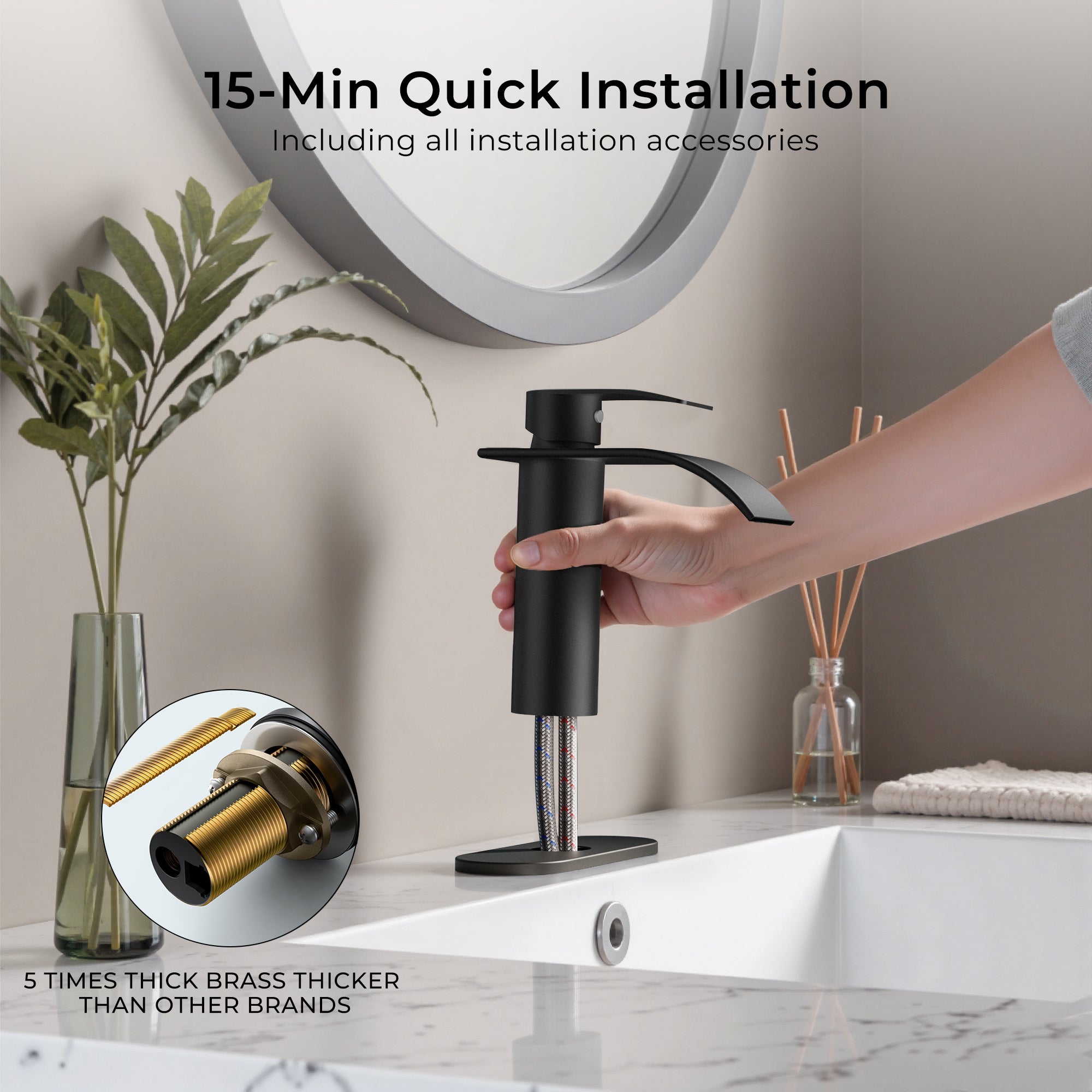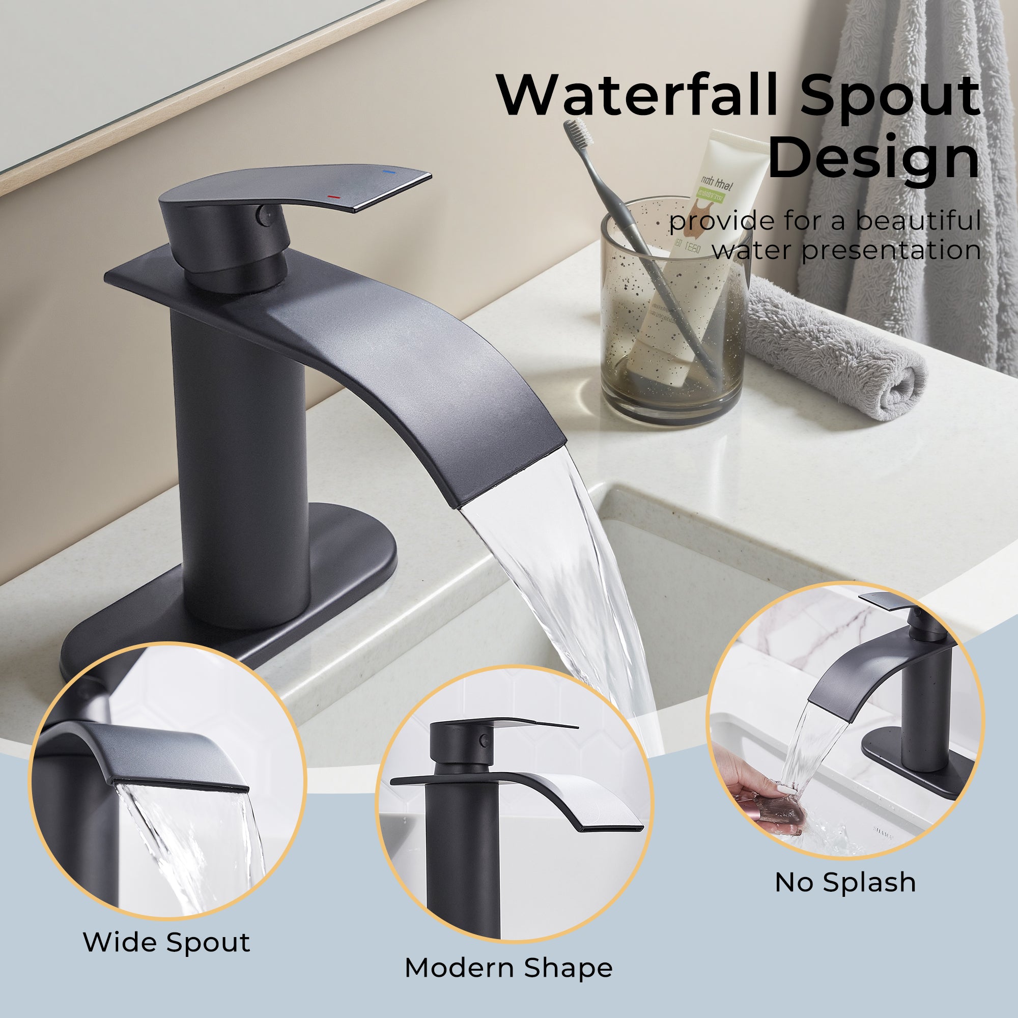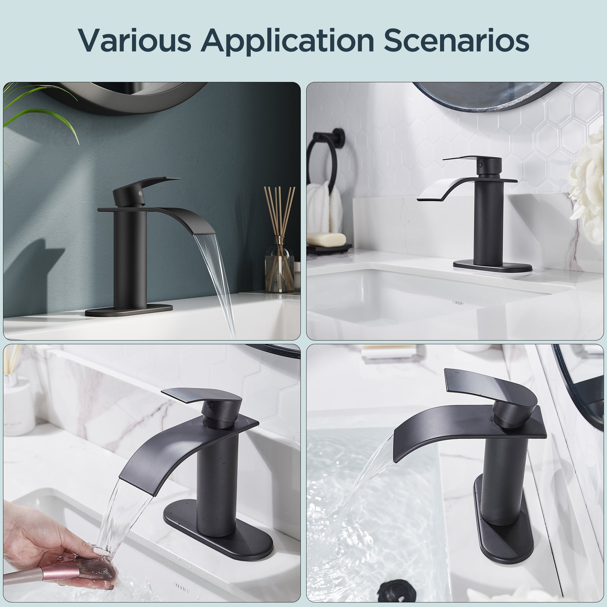 Anti-Splash Waterfall Design: Our bathroom sink faucet features a waterfall spout to reduce splashing. Ideal for compact spaces, maintains strong flow even with low pressure. Modern style meets practical performance.