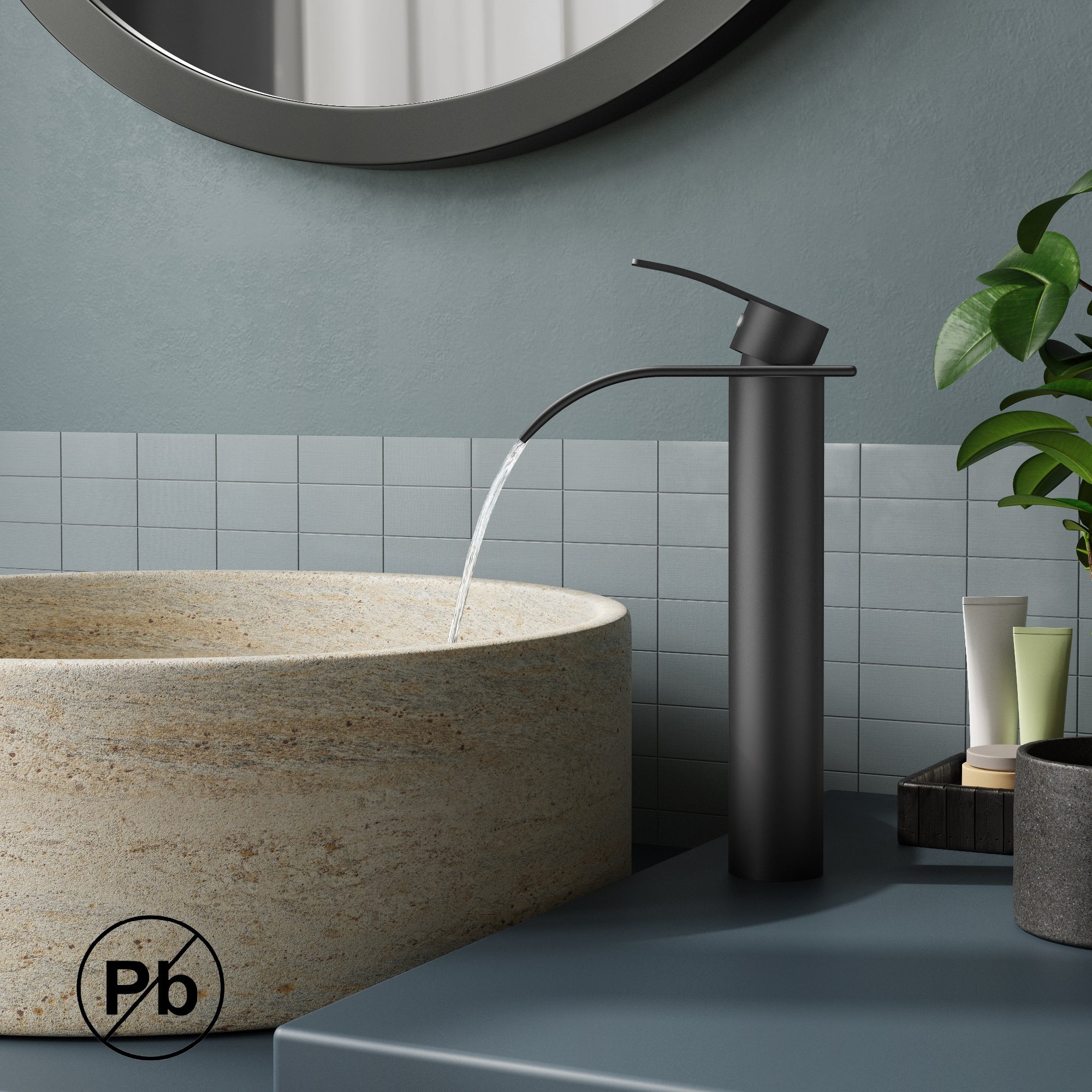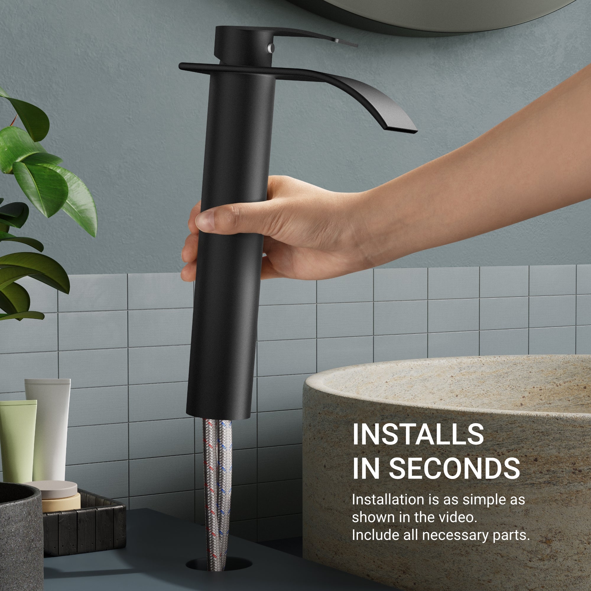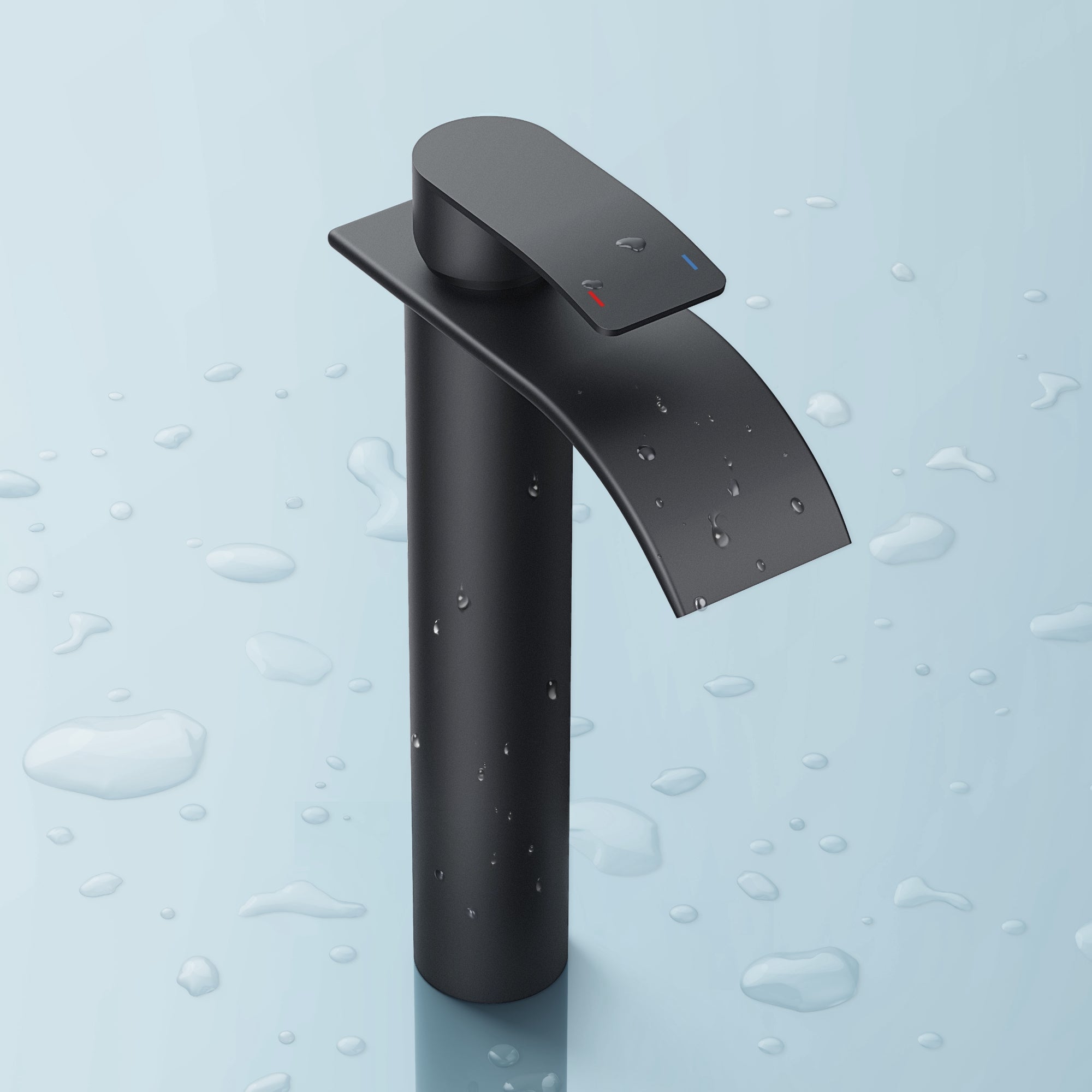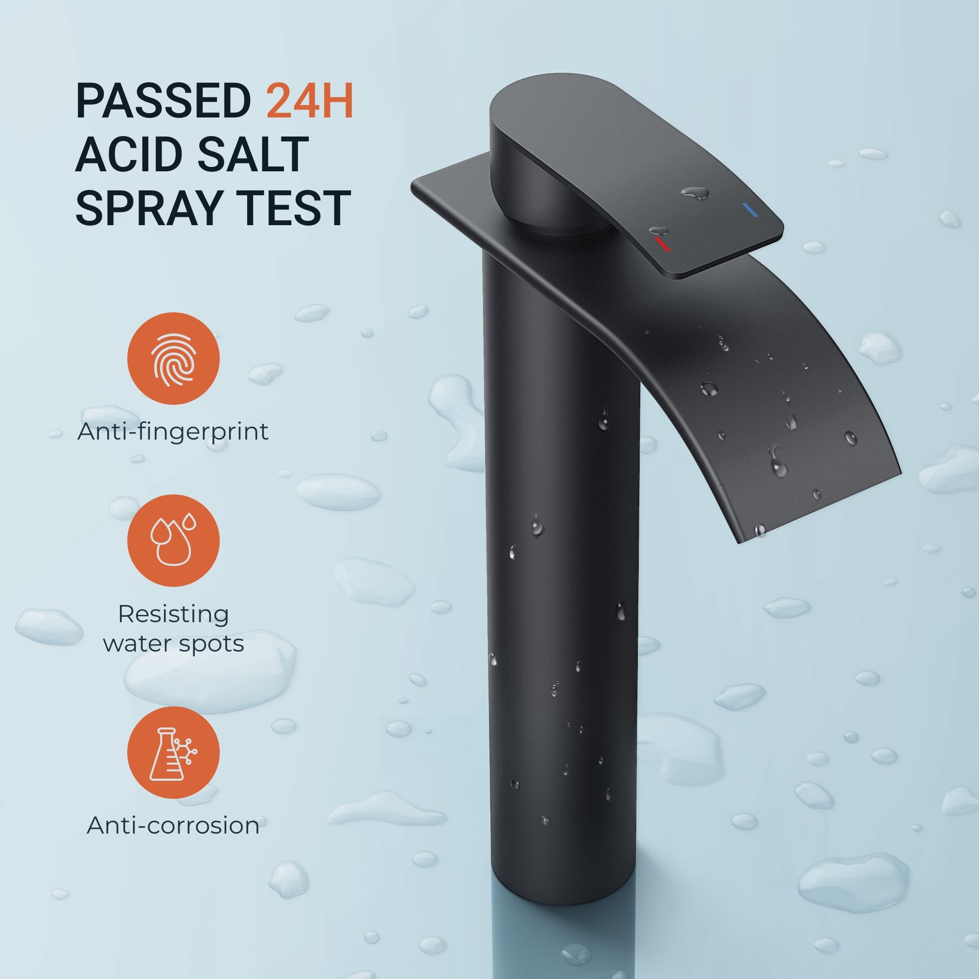 Anti-Splash Waterfall Design: Our tall bathroom sink faucet features a waterfall spout to reduce splashing. Ideal for compact spaces-maintains strong flow even with low pressure. Modern style meets practical performance.