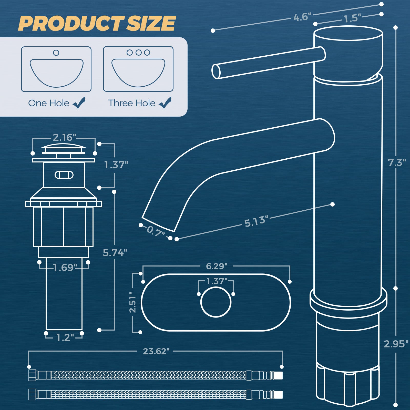 Our bathroom vanity faucet set comes complete with 3/8" threaded hot and cold supply hoses, features a 6.29 inch deck plate for 1hole or 3 hole sink. Watch our instructional videos and you can have it installed in just a few seconds!